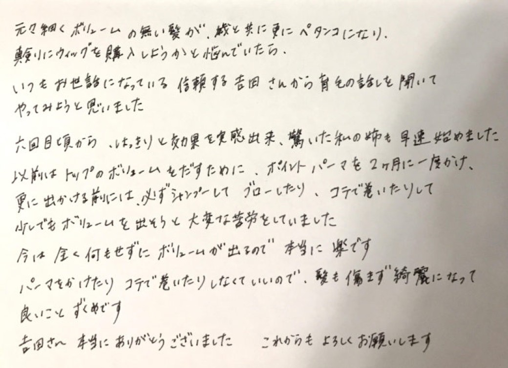 通い始めて、1年ちょっとになりますが、本当に髪一本一本がしっかりしたと実感しております。朝のスタイリングも本当に簡単になりました。