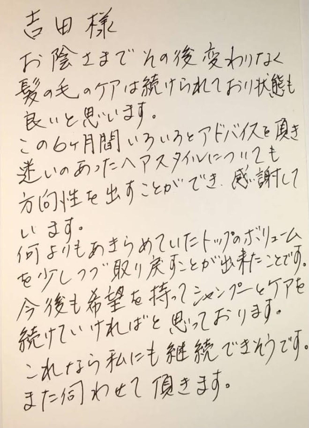 吉田さんにお願いするようになってから他の美容室へ行っていません。